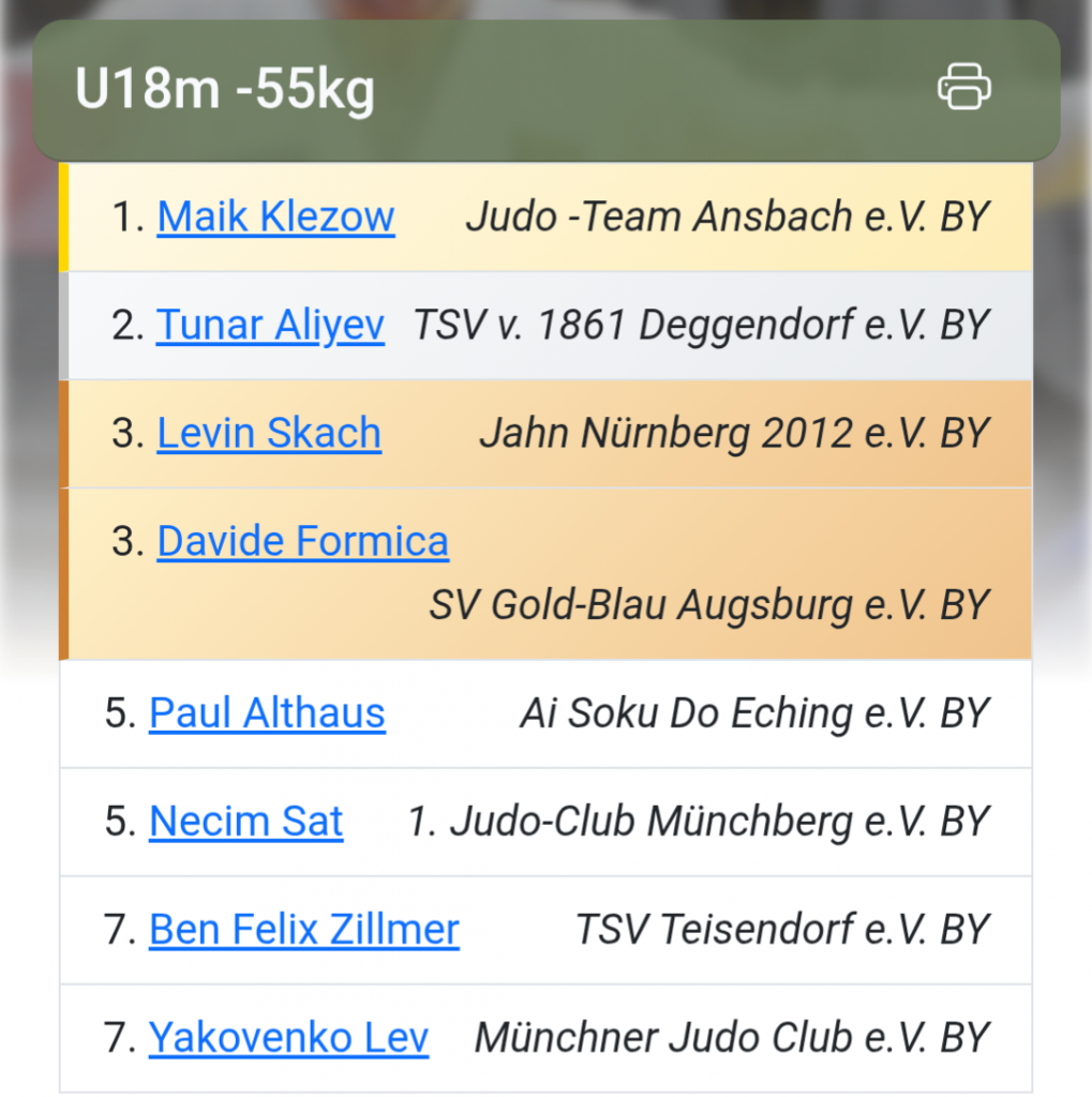 Max – im zweiten Jahr in der U18 – musste sich im Poolsystem 5 Gegner stellen, wovon einer verletzungsbedingt nicht kämpfte. In drei von den tatsächlich vier Kämpfen zeigte er hohe Konzentration, physische Überlegenheit und durchaus auch Technikvielfalt. Mal gewann er nach einer kleiner Wertung aus dem Stand mit Festhalter im Boden mal durch einfache Fußtechniken. Max probierte an diesem Tag viel aus, das gefiel sehr gut. Nur ein Gegner war an diesem Tag zu stark – der Griff des Gegners ließ Max nie richtig in seinen Kampf kommen. Stets wachsam für die gegnerischen Angriffe konnte Max denen immer gut entkommen und maximal kleiner Wertungen gegen sich hinnehmen. Nach fast der kompletten Kampfzeit war die physische Überlegenheit doch zu groß und Max musste sich geschlagen geben. Ein hervorragender 2. Platz – Bayerischer Vizemeister – Glückwunsch! Größter Erfolg für Max bisher!